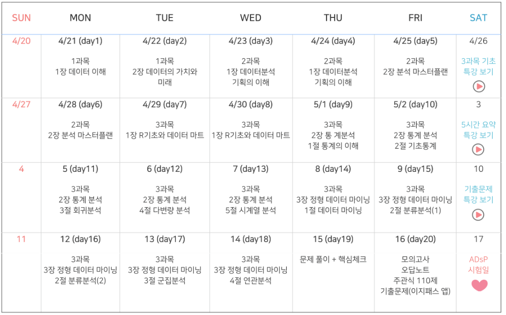 저 계획표에 조금 더 추가하자면 1과목 공부 전 아답터 1과목 들으시고, 2과목 공부 전 아답터 2과목 들으시고.. 이런 식으로 공부하시면 더 도움됩니다! 그리고 기출문제 풀 시간은 더 넉넉히 두면 좋아요~ 시험 전 3일 이상은 비워두고 기출문제 푸시고 오답하시는 게 좋아요!!