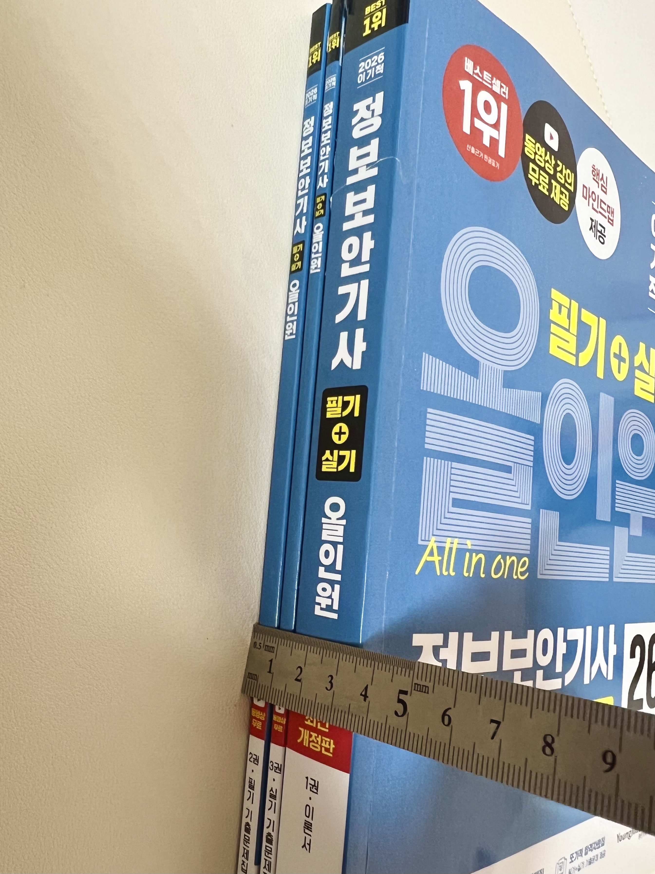 두께를 재본 결과 이론서는 2cm, 필기 기출문제집은 0.7cm, 실기 기출문제집은 0.6cm이고 다 합쳐도 3.5cm 정도라서 편하게 들고 다니기에 부담이 없습니다.