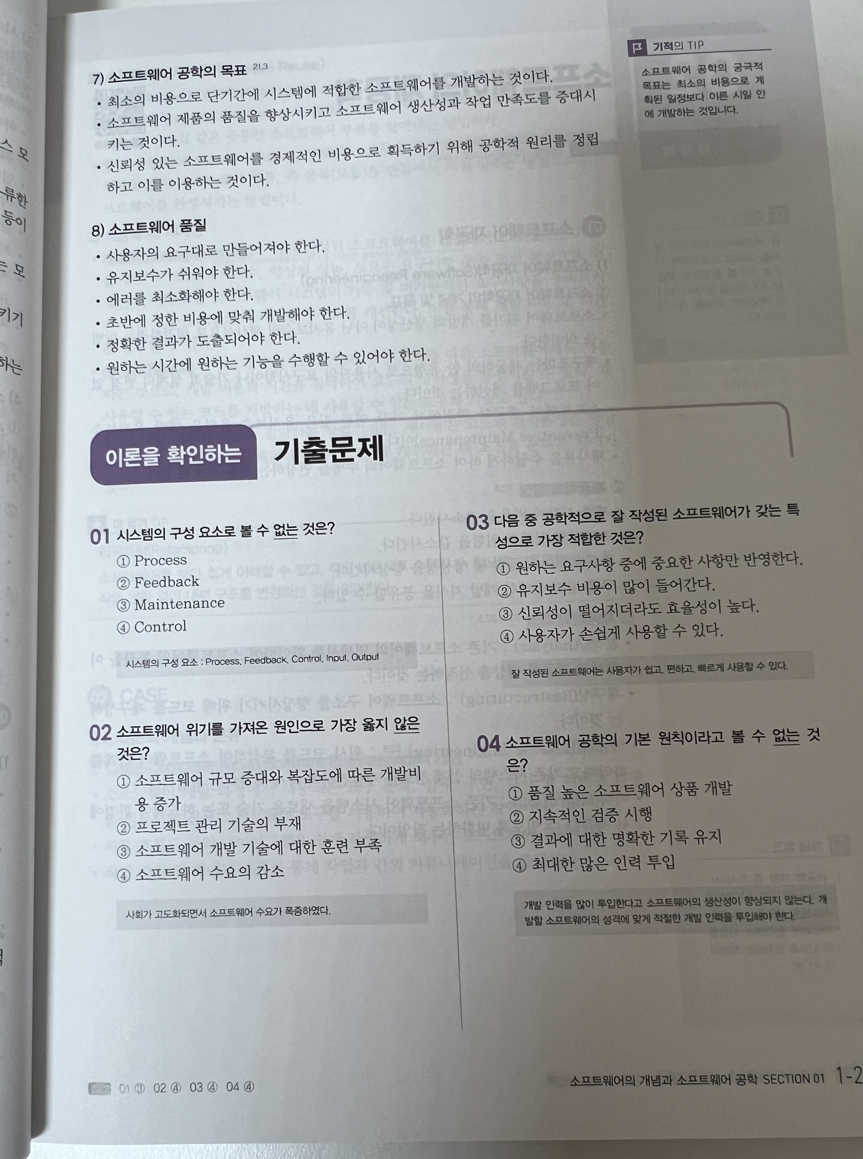 한 SECTION이 끝날 때마다 이론을 확인하는 기출문제 파트가 있습니다. 내가 개념을 올바르게 공부했는지 확인하기 위해 기출문제를 풀어볼 수 있습니다. 밑에 바로 답과 간단한 풀이가 적혀 있어서 빠르게 확인하기 좋았습니다.