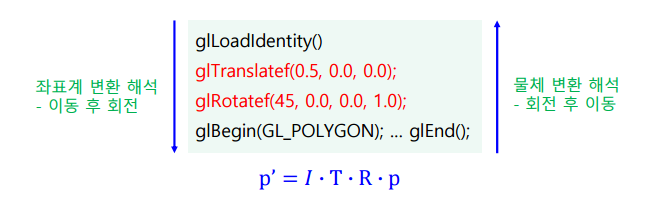 - 좌표계를 이동한 후 회전시키고 물체를 그림