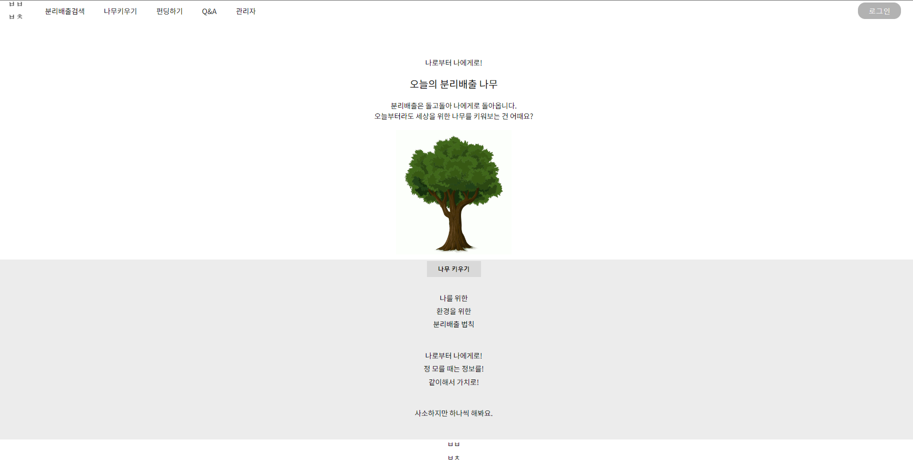 분리배출 정보를 제공하고, 펀딩 및 친환경 제품 판매, 분리배출 인증을 통해 포인트를 모으고 나의 분리배출 나무를 키울 수 있는 사이트이다.