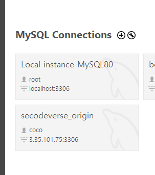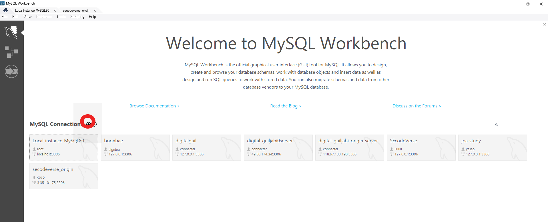 1. MySQL Workbench를 실행한다. MySQL Connections에서 + 클릭
