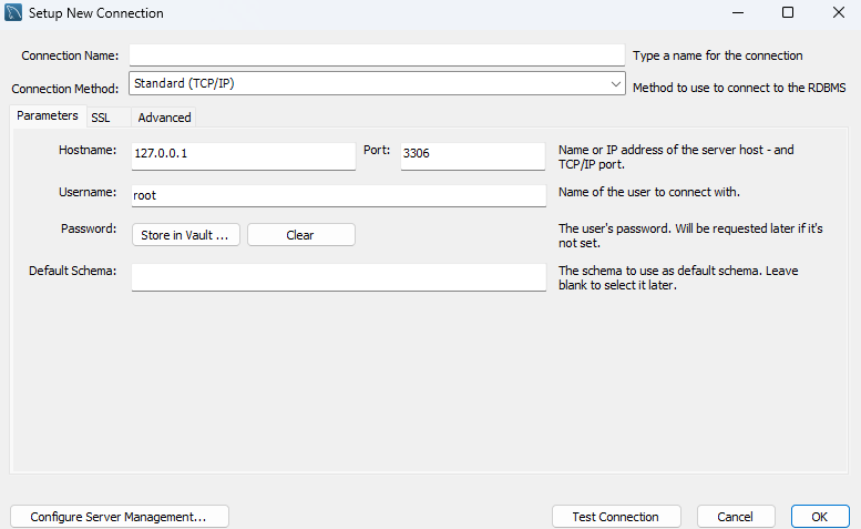 Default Schema는 지정해줘도 되고 그냥 빈칸으로 비워도 됨. Test Connection 클릭.