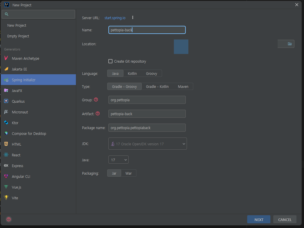 2. Spring Initializr 클릭 후 원하는 설정 지정