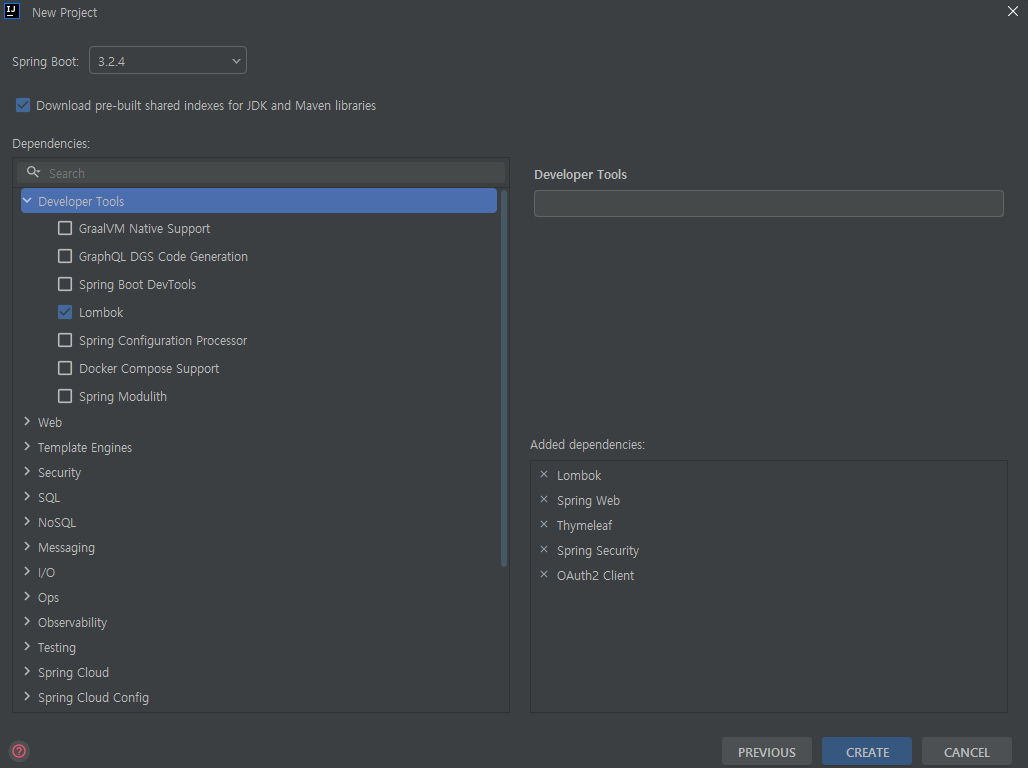 3. NEXT 클릭 후 버전 및 Dependency 설정. 저는 가장 최신의 안정적인 버전인 3.2.4(2024.03.31 기준)을 사용했으며, 필요한 dependency를 추가해주었습니다.