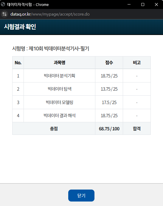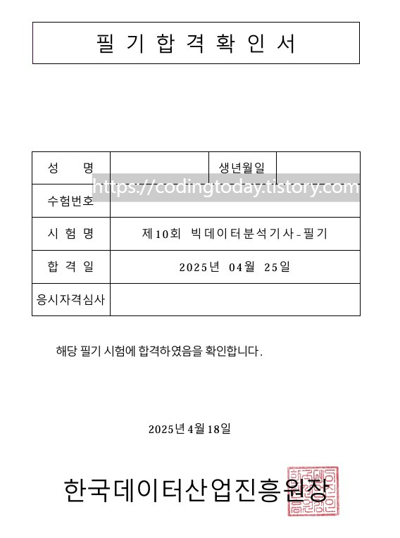 2025.04.25 - [자격증] - 제 10회 빅데이터분석기사 필기 독학 합격후기 (교재 추천, 비전공자 공부법) 제 10회 빅데이터분석기사 필기 독학 합격후기 (교재 추천, 비전공자 공부법)안녕하세요!제 10회