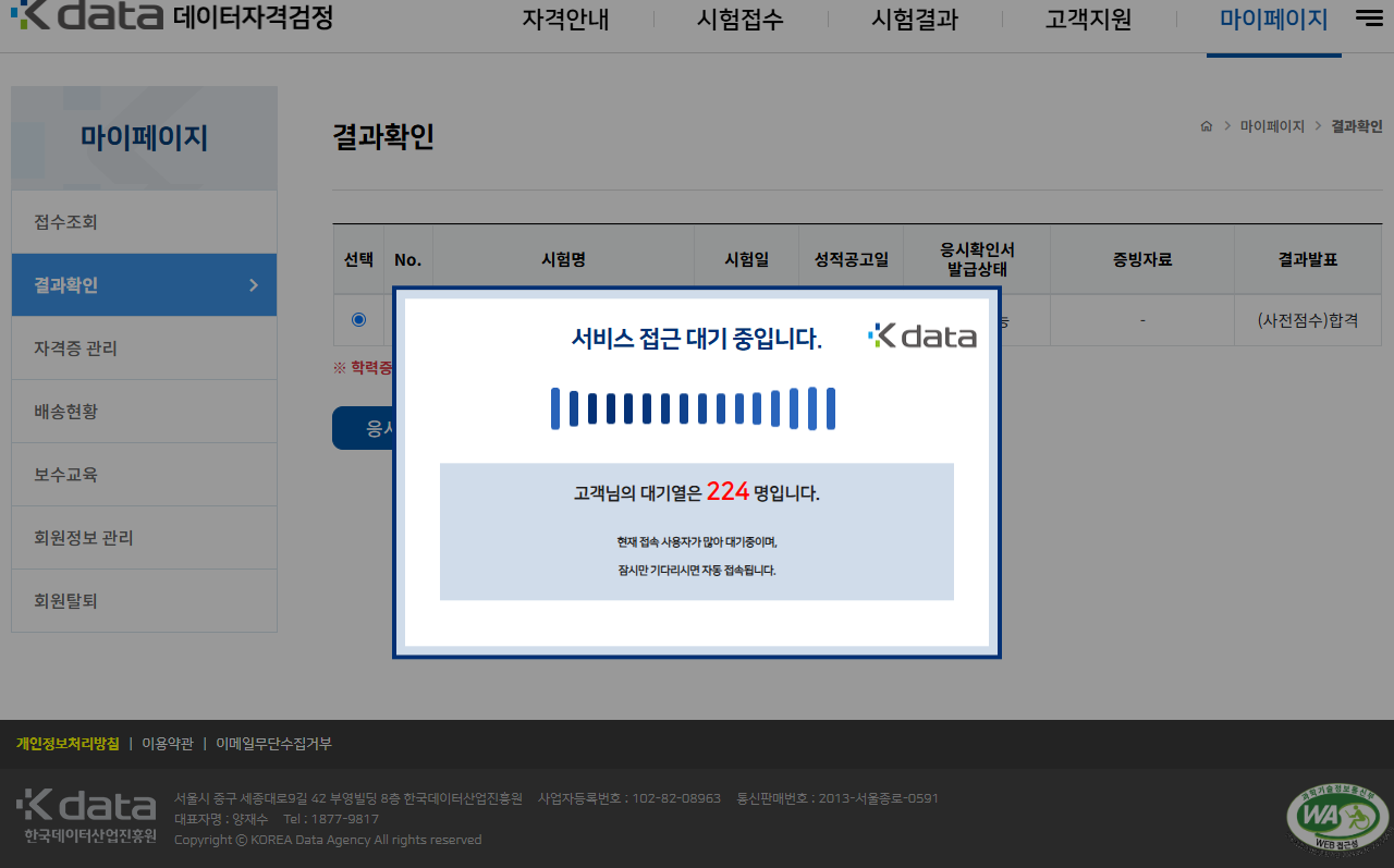 접속자수가 많아서 이런식으로 대기열이 뜨게 되는데, 잘 보시면 결과발표에 (사전점수)합격이라고 떠 있습니다.